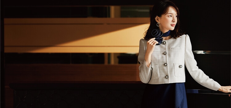 首元を飾る事務服リボンやスカーフは、簡単に取り外しができ顔まわりを明るく見せてくれます。オフィス制服のベストやワンピース、ジャケットなどにスカーフを加えるだけで印象が大きく変わります。華やかかつ爽やかさを演出してくれるオフィスユニフォームのアイテムです。