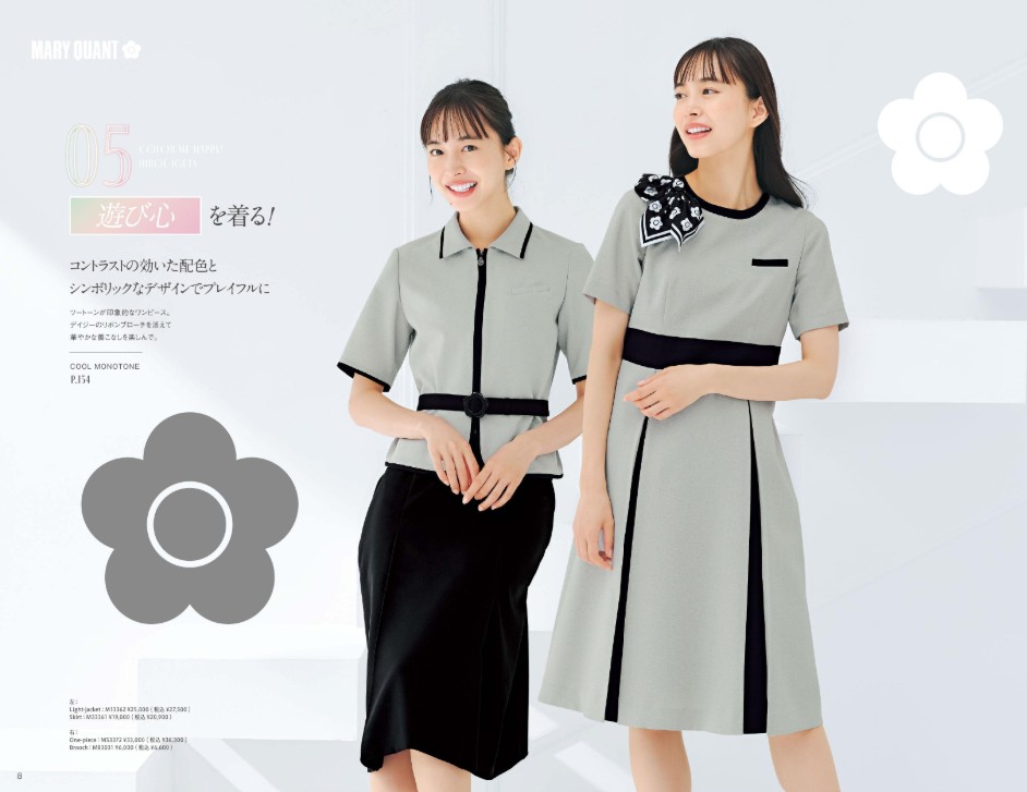 細かいチェック柄の企業受付制服におすすめなジャケットは、モダンとクラシカルの要素が融合された一着です。幾何学模様のパターンは、視覚的にリズムを与えつつも派手過ぎず、洗練された印象を醸し出します。この柄は古典的な由来を持ちながらも現代にも馴染み、時代を超えたデザインとして人気の「マリークワント」オフィスユニフォーム。