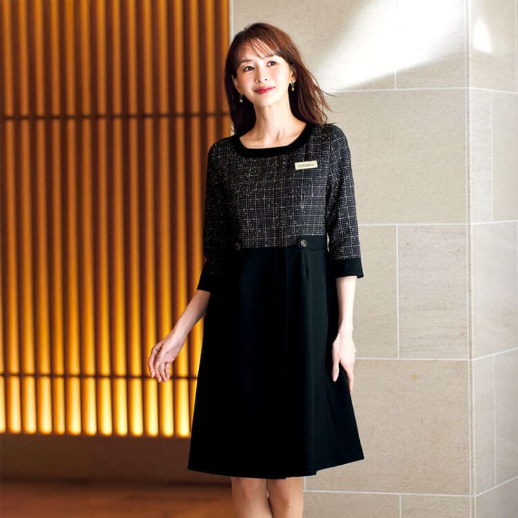 上品で洗練された印象を与える事務服ワンピースは、レセプションやホテルフロントなど、接客の最前線で働く女性スタッフに人気のユニフォームです。シンプルなシルエットながら、美しいラインと程よいストレッチ素材で動きやすく、長時間の着用でも快適。お客様を迎える立場として、第一印象を大切にする職場に最適なスタイルです。上品さと清潔感を両立したコーディネートで企業のブランドイメージを高めたい法人様にもおすすめです。上質な制服をお探しの方は、事務服ワンピース特集をご覧ください。