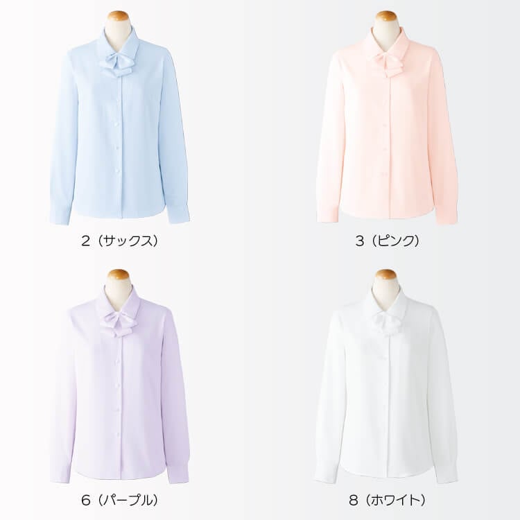 多機能な加工(抗ウイルス加工・抗菌防臭・透け防止・ストレッチなど)を施したオフィスユニフォーム素材とリボン付きデザインは、定番の事務服ブラウスです。
