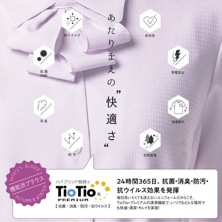 【Tio Tio®プレミアム】 抗ウイルス・抗菌・消臭・防汚 の高機能素材は、毎日着用する 事務服(ブラウス)を清潔に 保つハイブリット触媒加工!。
