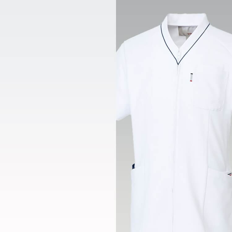 工業洗濯可能な素材と縫製仕様、 丈夫な医療用白衣 です。