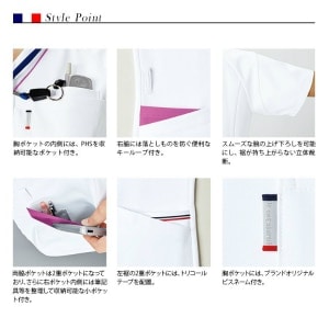 ホワイトを基調としたVネック「ケーシー白衣」。ポケットにはトリコロールのアクセントを加え、フランスのブランドらしい演出した「ルコックスポルティフ」医療用ケーシー白衣。工業洗濯も可能な医療白衣ですので、レンタル業者での洗濯にも耐える強い素材です。多彩な機能を持つ男女兼用のケーシー白衣です。