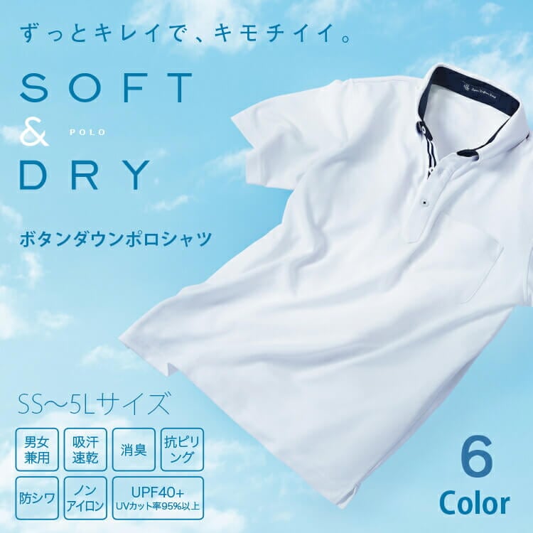 会社のユニフォームにピッタリのボタンダウンポロシャツ。シンプル・高機能・男女兼用・サイズSS~5L。介護・宅配・店舗・配送業にもおすすめなポロシャツ制服。汗をかいても吸汗速乾ポロシャツなので清潔感を保ちます。