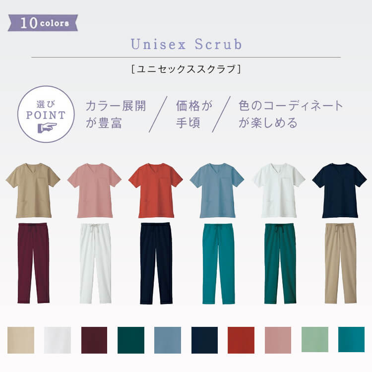 品の良いシックなカラーと佇まいが、落ち着きと信頼感を演出する男女兼用の医療スクラブ白衣。
