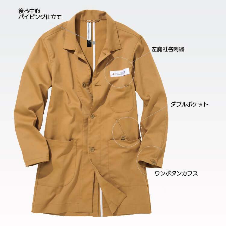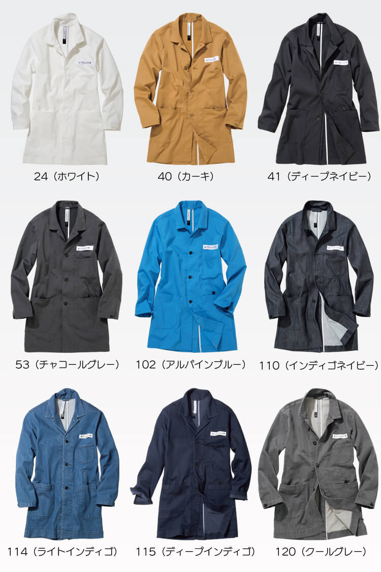 【エンジニアコート】は、男女兼用のストレッチ素材を使用したイージーケアのコートです。SSサイズから5Lまでの9色展開となっており、店舗スタッフのユニフォームに最適です。
