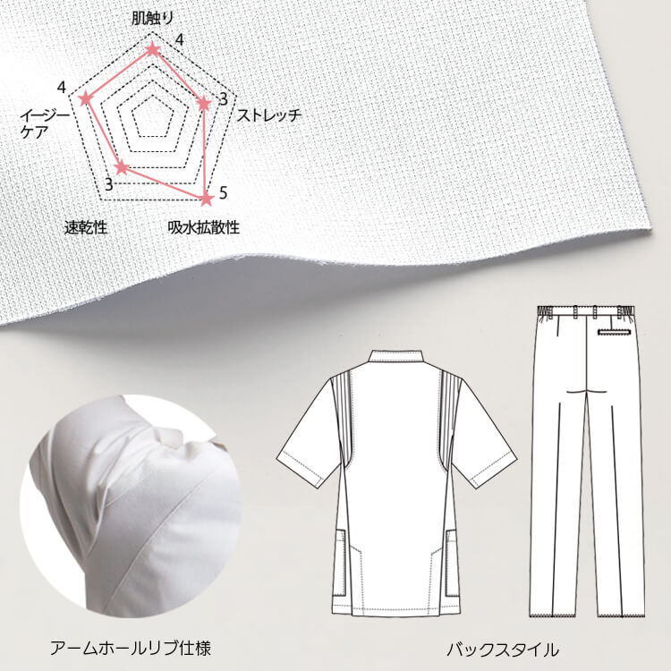 汗をすばやく吸収、拡散、蒸発 させるので、サラッとした優しい 肌触りで、ムレ感もないケーシー 白衣上下セット。