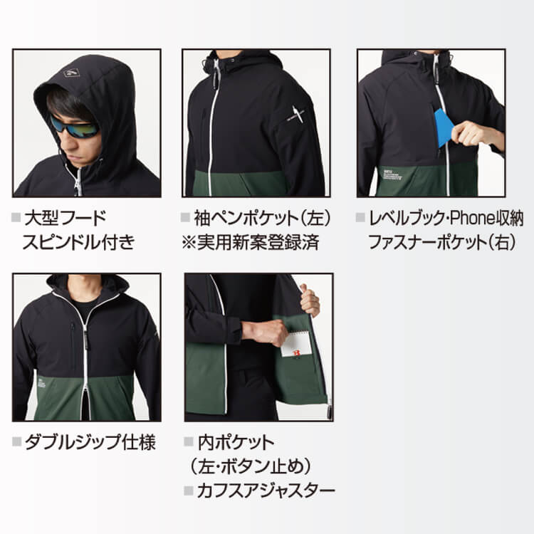 また軽量で4方向に伸縮するストレッチ素材は、ストレスフリーな着用感で様々なワークシーンに対応する作業ジャケット。優れた帯電防止を備えるJIS T8118適合作業服なので業種を問わず着用できる万能型の作業着フード付きです。