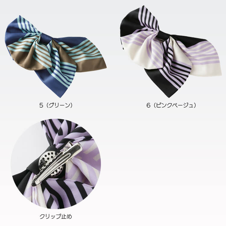 クリップで止めるブローチ仕様なので、簡単に取り付け・取り外し可能です。受付制服・店舗ユニフォームなどにおすすめのリボンスカーフです。