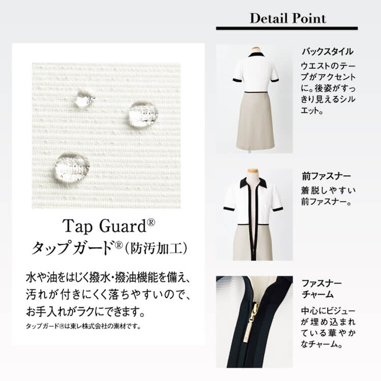 水や油を弾く撥水・撥油機能 を備え、汚れがつきにくく、 落ちやすいので、ホワイト× ベージュ色のワンピースでも 安心してご着用でるサロンユニフォ ームです。