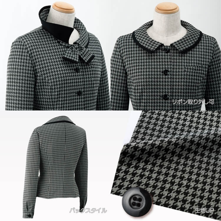 ジャケット感覚で着用できる事務服オーバーブラウス長袖。取外し可能なリボンは、外してすっきりシンプルなデザインでも着ていただけます。 定番の千鳥柄でありながら、ツイード風(杢調)のオシャレなオーバーブラウス制服。またニット素材で伸縮性に優れた動きやすく、シワになりにくいオフィスユニフォーム素材です。