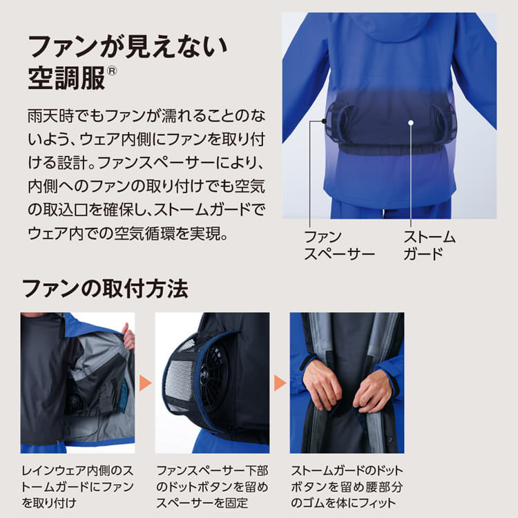 梅雨時の湿度の高い雨天時でもより活動的に動ける高耐水・高透湿のレインウェア「ゴアテックスファブリックス」と空調服(ファン付きウェア)を合わせることにより、作業効率を高めてくれる夏の雨天時におすすめ雨合羽作業服レインウェアです。※ファン&バッテリーは別途お買い求めください。