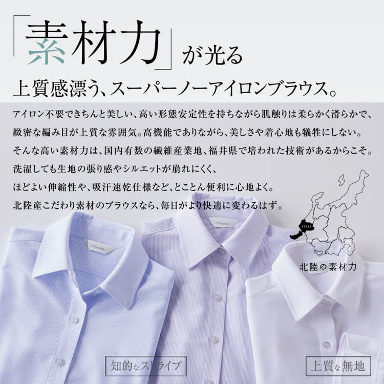 透け防止機能も備えているため、下着が透ける心配もありません。プロフェッショナルな印象を与えることができます。ノーアイロン仕様でありながら、シワになりにくいので朝の準備時間を短縮することができます。