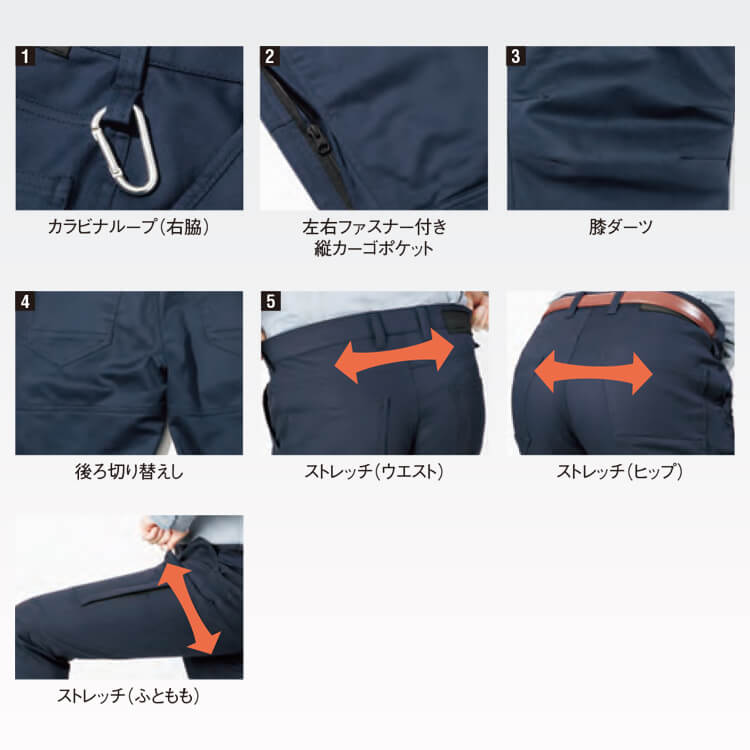 デザイン性を意識したカーゴポケットで、ストレッチ素材を活かした細身のスレンダーなシルエットの作業服カーゴパンツになります。