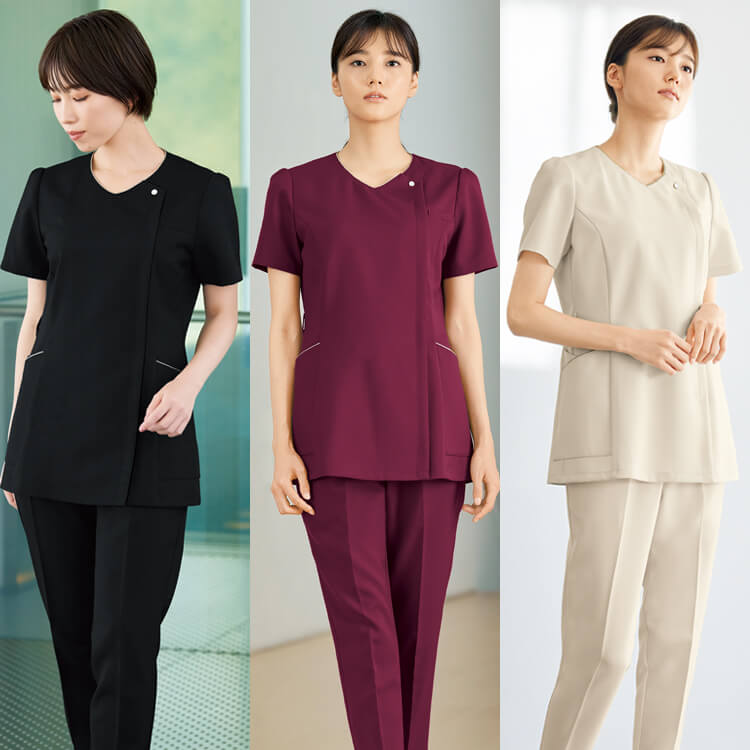 この制服は、エステサロンだけでなく、クリニックや美容系ユニフォームなどでもご利用いただけます。プロフェッショナルな雰囲気を演出し、お客様に安心感を与えるユニフォームです。