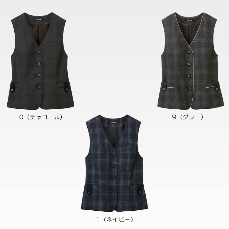 チャコール・ネイビー・グレーのカラーによって印象が変わるトラッドテイストで、幅広い職種に対応するクラシックチェック柄の事務服ベスト。