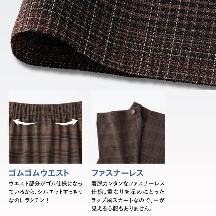【事務服スカート チェック柄】 ストレッチ・抗菌消臭・防汚抗ウイルス・ECO 60㎝丈(9号) 家庭洗濯可 5~23号 ブラウン TioTio/セロリー