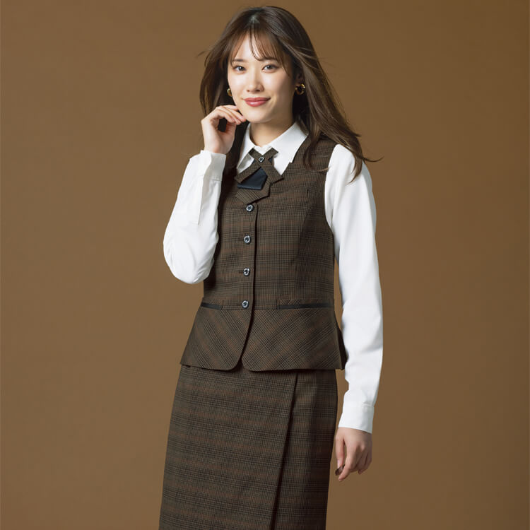 【事務服リボン チェック柄】は、オシャレで可愛らしいデザインの受付制服/店舗ユニフォームです。ブラウンのチェック柄が上品さを演出し、控えめなリボンが女性らしさを引き立てます。フリーサイズなので、多くの方にお使いいただけます。