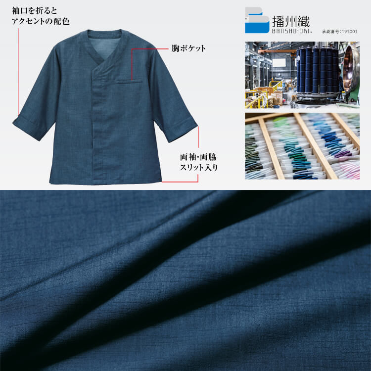 播州織の「和紙デニム」横糸に和紙を使用したデニム織り。和の風合いにこだわりスラブ糸も加えました。調温性に優れ、軽くて強いうえ、乾きやすくて、蒸れにくく、肌触りも柔らかな和食制服シャツ。汗をかく季節から寒い季節のまで一年を通して快適な飲食店(居酒屋)ユニフォーム。デニム素材を使用したニュースタンダードな和風制服シャツです。