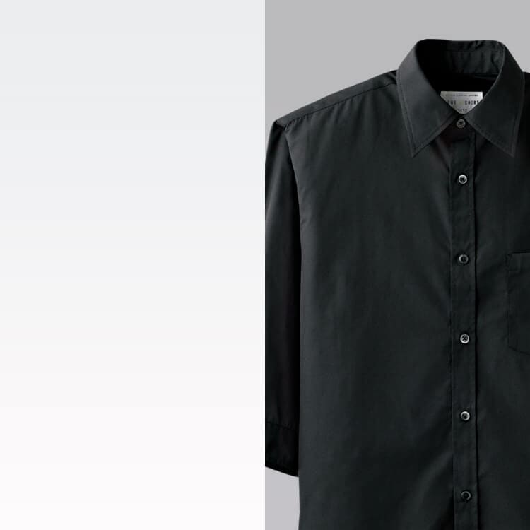 黒いボタンがアクセントのベーシックデザインの飲食店制服やショップ制服にオススメの七分袖シャツ。