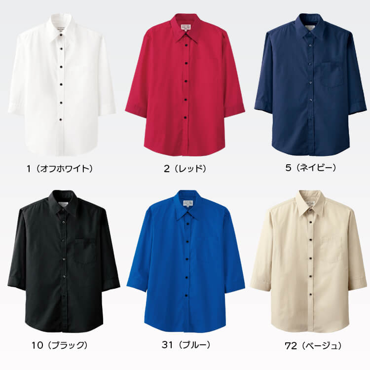 黒いボタンがアクセントのベーシックデザインの飲食店制服やショップ制服にオススメの七分袖シャツ。 男女兼用の6色展開のシャツ制服は、着回しやすい業務ユニフォームです。