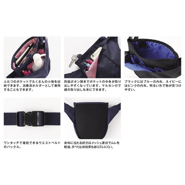 あらゆるシーンで活躍する人気のウエストバック。 コンパクトデザインでありながら2つのポケットで、たくさんの小物を収納することが出来る介護制服ウエストバックです。