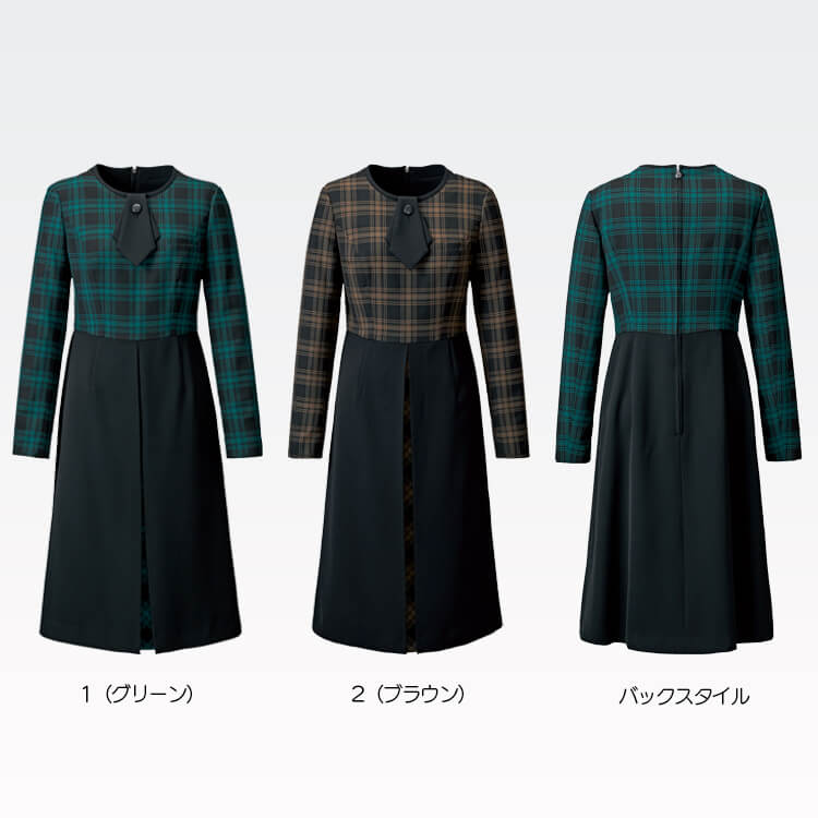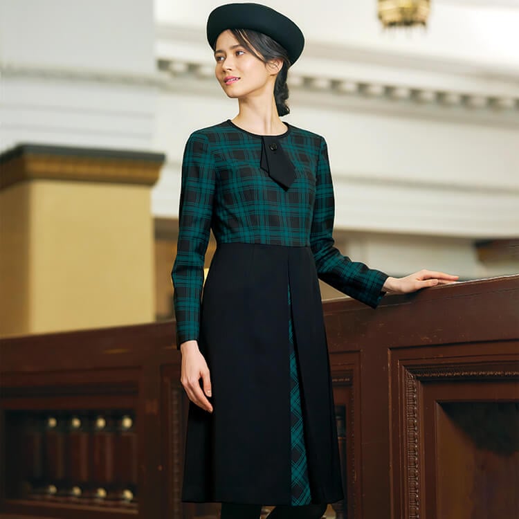 企業受付制服・ショールーム・オフィス制服・タータンチェック柄 接客制服・ホテルフロント制服・受付ワンピース・タータンチェック柄