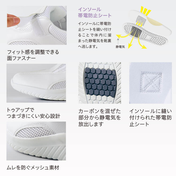 静電気の放電による不快感や機器の不具合を防止する帯電防止素材を使用したナースシューズ。 超軽量(170g/23.5㎝ 片足の重量)、ムレ防止メッシュ仕様、インソールの形状など、医療の仕事を足元からサポートするメディカルシューズです。