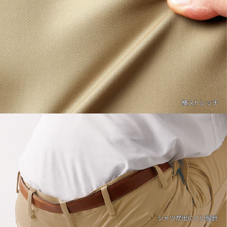 介護現場での着用に最適なズボンです。ストレッチ性のあるチノパン素材は、膝を曲げたり、体を動かしたりする際にも自由な動きをサポートします。また、腰回りの脇ゴムは、長時間の立ち作業でも腰に負担をかけずに快適に過ごせます。男女兼用のデザインなので、さまざまなスタッフさんに幅広くご利用いただけます。