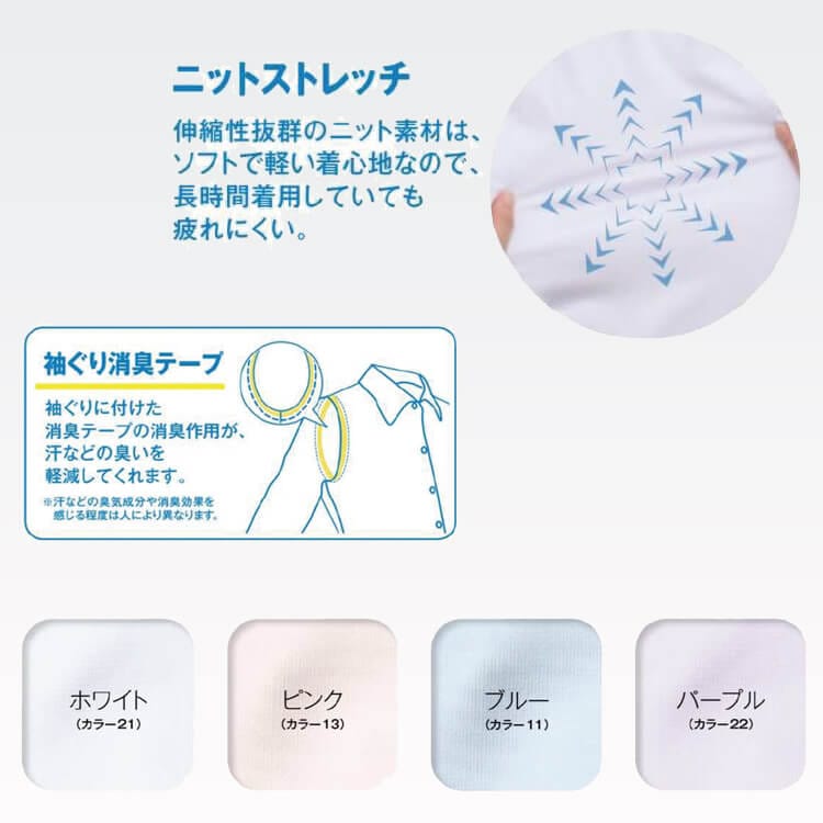 【レストランブラウス 長袖】は、抗菌防臭効果があり、いつでも清潔で爽やかな状態を保ちます。また、ニットストレッチ素材を使用しており、自由な動きが可能です。吸汗速乾性にも優れており、忙しいレストランでの作業中も快適さをキープできます。さらに、防汚加工も施しているため、シミや汚れも気にすることなく長くご利用いただけます。ノーアイロン仕様だから、アイロンがけの手間も省けます。5号から23号の豊富なサイズ展開と4色のカラーバリエーションは、飲食店制服としての要求にもお応えできます。ぜひ、プロのための一枚をお試しください。コストパフォーマンスが高いレストランブラウスです。