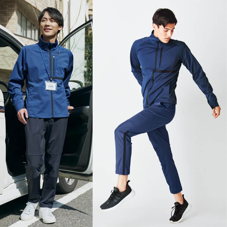 またストレッチ性に富んだマットな素材をスタイルよく見せる細身シルエットでスタイリッシュに。動きやすさ・作業効率をUPさせる機能も随所に散りばめている介護士ジャージです。
