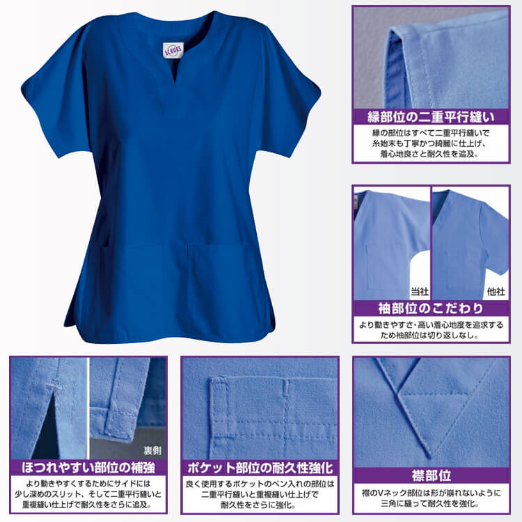 ウエストを絞り、きれいなカーブの衿元と袖で優しくスタイルアップしたレディース医療スクラブ。また縫い目が丈夫なダブルステッチ(二重強化縫製)が施されているため、繰り返しの洗濯や乾燥にも強く、長い期間に渡って着用することができる強度性が非常に高い医療白衣です。