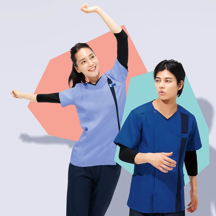 おしゃれな介護ユニフォーム、ポロシャツ、介護士エプロン。