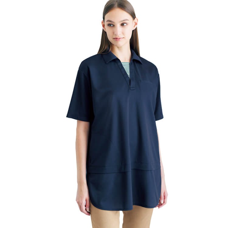 【エステ制服 ポロシャツ】 ロング丈は男女兼用で、ストレッチ性があります。さらに、撥水撥油加工と防汚加工が施されているので、お仕事中も安心です。SSサイズから5Lサイズまで展開しており、幅広い方に対応しています。デザインもシンプルで使いやすく、エステティシャンの方々におすすめです。