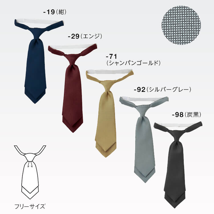 ワンタッチで装着ができる5色展開のレディースショートネクタイ制服。お店のイメージや部署別など、カラー選択ができます。