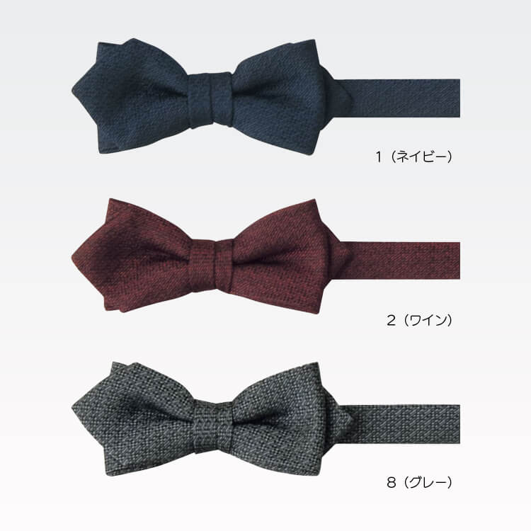 一見無地に見える蝶タイですがジャカード織りによる複雑な柄と濃淡数色の使用により、奥深い生地表現のある高級感漂うシックな剣先蝶ネクタイ。