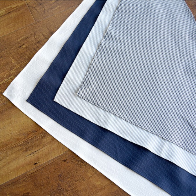 シアサッカー生地を使用した薄手ので軽く涼しく快適な三角巾ユニフォーム。無地からチェック、ストライプと柄バリエーションあり、色々なシーンに合わせることができる三角巾スカーフです。 ※アイロンをしっかりあてるとサッカー調の風合いが無くなりますので、低温で軽くあてるか、あてずに使用することをオススメします。