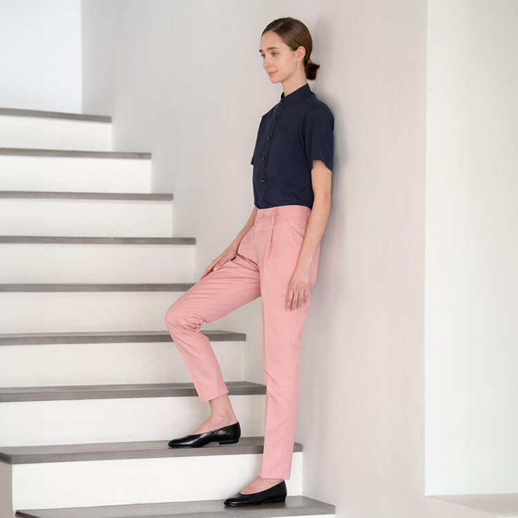 すっきりとしたシルエットでありつつ、ウエストにタックが入っている為、オールマイティーに色々なコーディネートに対応可能な店舗接客ユニフォーム。素材にはストレッチ性を持たせたポリエステル高混率のしっかりとした肉感のあるツイル生地を用いています。耐久性がありメンテナンスのしやすいレディースパンツ制服。 カジュアルと品格のちょうどいいバランスで、多様化する新しい接客のコンセプトに対応したホテル・接客制服パンツ。またユニフォームとして、珍しいピンクカラーのメンズパンツも取り揃えております。