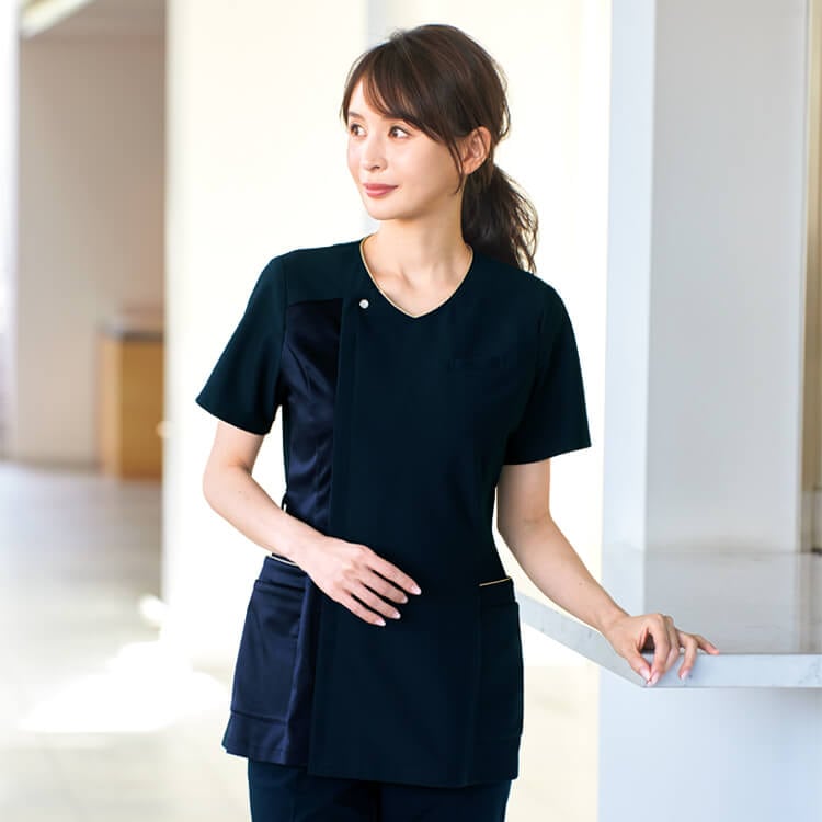 光沢感のあるサテン配色が、上質な佇まいを演出する医療スクラブ白衣。2WAYストレッチ素材を使用した抜群の動きやすさが魅力の医療白衣ユニフォーム。