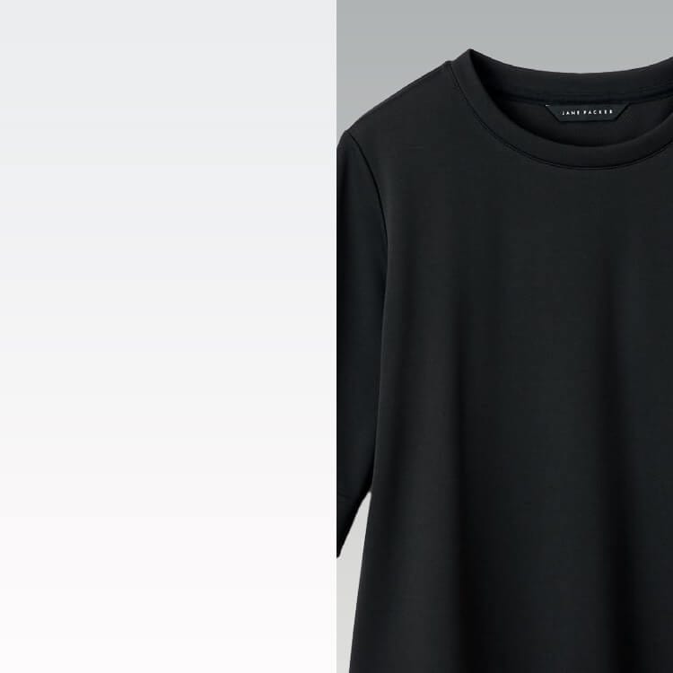 ベーシックな丸首タイプの事務服カットソー。二の腕をほっそり見せる袖にこだわりました。シンプルで上質なJANE PACKER(ジェーンパッカー)のオフィスユニフォームカットソー。