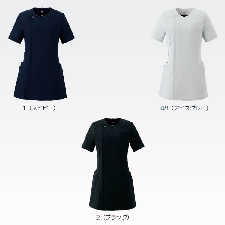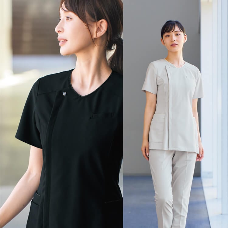 ひとつひとつの動作も美しく見える働く姿に気品を宿す前ファスナー仕様のエステユニフォーム。衿には生地のカラーに合わせたパイピングテープとボタンを使用したデザイン。