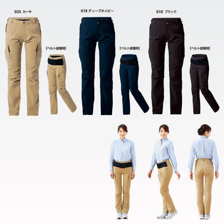 腰部のサポートベルトを装着が できるカーゴパンツ。履くだけで フィットする作業ズボン。