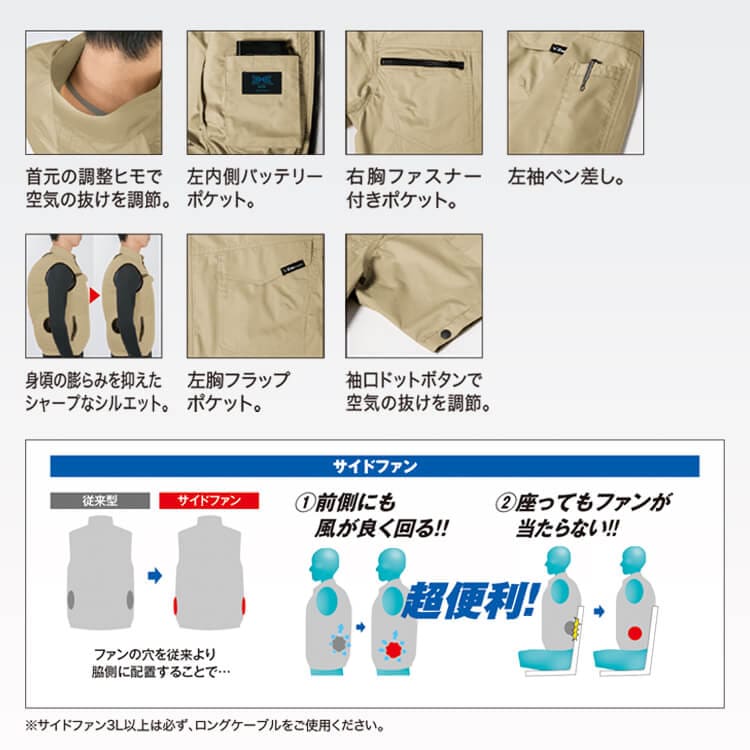 【使用ケーブルについて】 この商品は従来の空調服®よりファンの位置が脇側に配置されています。3L以上を着用される場合はロングケーブルをご使用ください。