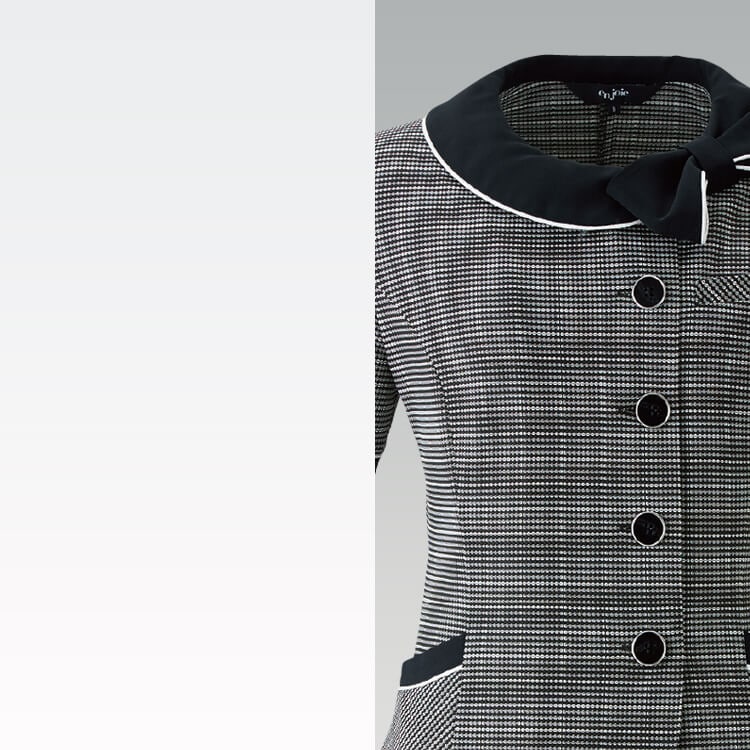 モノトーンチェック柄とアシンメトリーデザインのリボン衿が、大人かわいい事務服オーバーブラウスです。 夏場にうれしい吸汗速乾と通気性により、快適なオフィスシーンを提供するオーバーブラウス制服です。