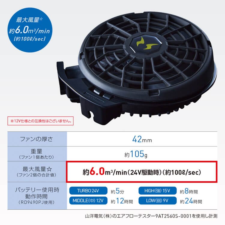 最大風量(24V時)約100l/秒。 業界トップクラスの空調服 ファンセット。