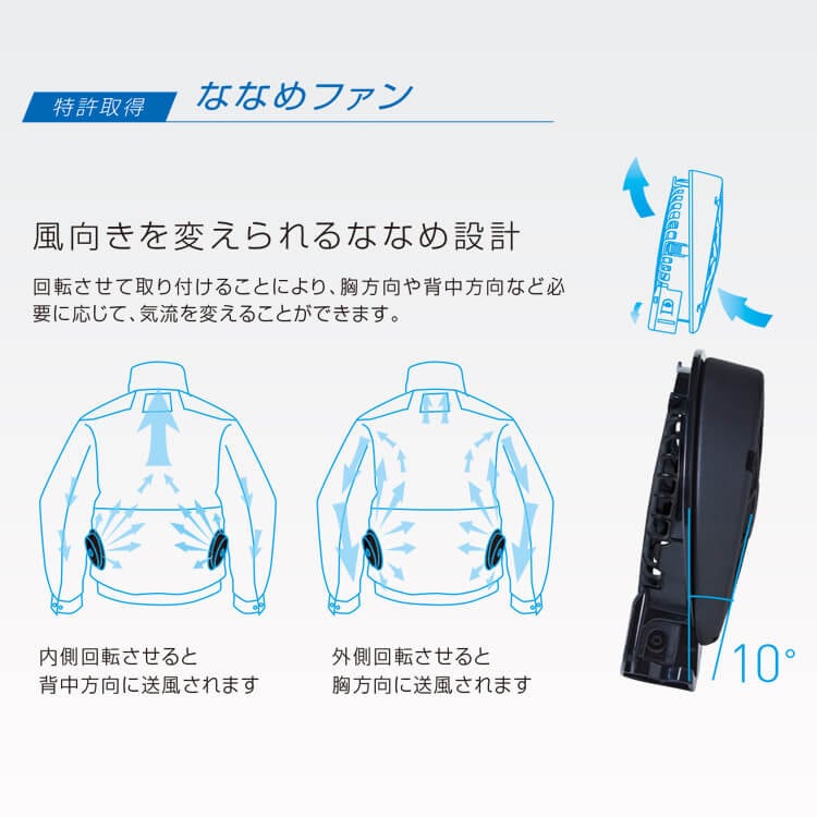 ななめタイプのファンは、風向きを自由に変えられ、外側に回転させると胸や脇方向への送風となり、内側に回転させると背中方面に送風される空調風神服ファンです。