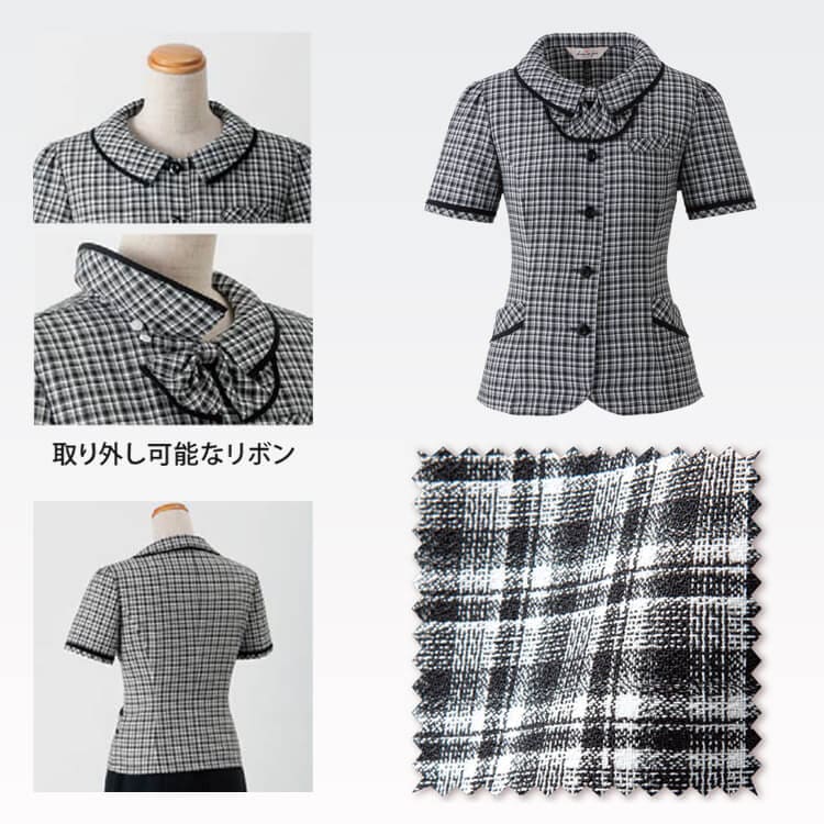 首元のリボンは取外し可能。リボンを外してすっきりシンプルに着用いただける2WAYデザインの事務服オーバーブラウス。 またアシンメトリーのチェック柄で、適度なハリコシがるので、仕立て映えがよく、シワになりにくいユニフォーム。透け防止、UVカット、吸汗速乾、通気性など夏場にうれしい素材のオフィスオーバーブラウス制服です。