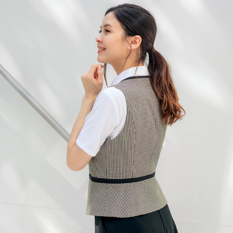 ダイヤモンドネックが端正な印象を与えてくれる夏おすすめオフィス制服ベスト。ペプラムシルエットがスマートに見えるベスト制服。 高通気性で涼しく、環境にも優しいエコ素材で、しなやかさと心地良いハリ感を実現した大人かわいいドットのようなチェック柄の夏用におすすめ事務服ベスト。