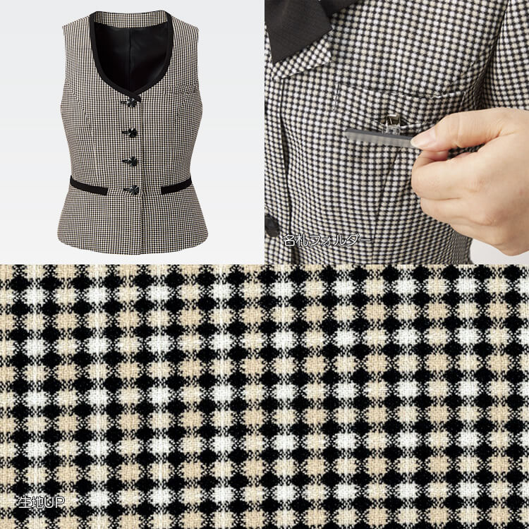 高通気性で涼しく、環境にも優しいエコ素材で、しなやかさと心地良いハリ感を実現した大人かわいいドットのようなチェック柄の夏用におすすめ事務服ベスト。