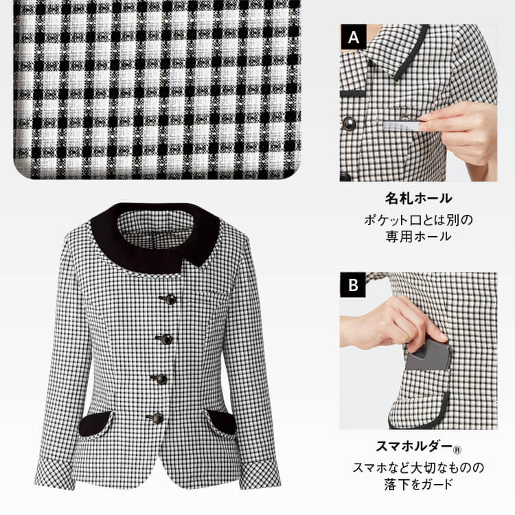 【事務服オーバーブラウス 八分袖】 チェック柄は、夏にピッタリな高通気素材で作られています。吸汗速乾機能がついているので、長時間着用してもさわやかな快適さをキープします。家庭洗濯可能でお手入れも簡単です。サイズは5~17号まで取り揃えており、モノトーンのシックなデザインはどんなコーディネートにも合わせやすく、夏の会社制服としてもおすすめです。
